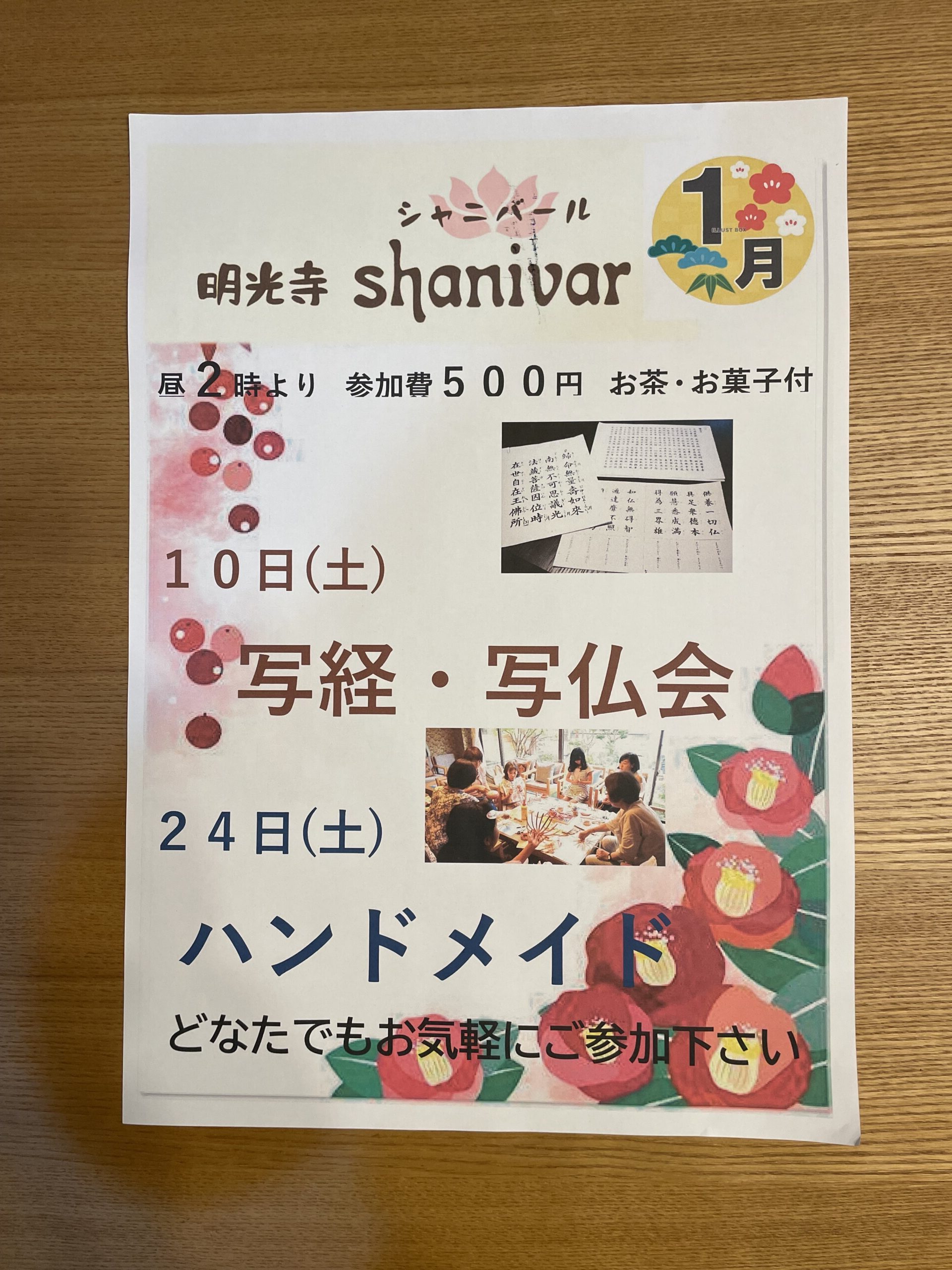 1月度のシャニバールで第三土曜の1月17日に予定しておりました。『仏教を学ぶ』ですが、講師に当日急な予定が入った為お休みさせていただきます。 10日㈯の写経・写仏会と24日㈯のハンドメイドは予定通り行…