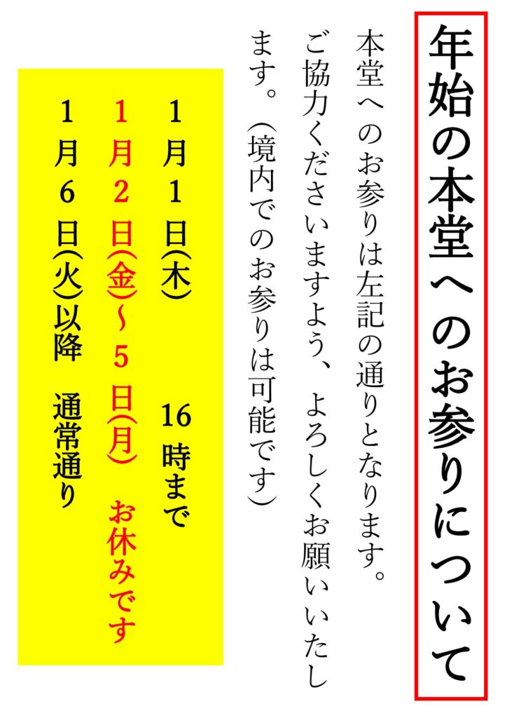 今年も残りあとわずかとなりました。例年通り年始の本堂へのお参りのご案内です、ご協力よろしくお願いします。